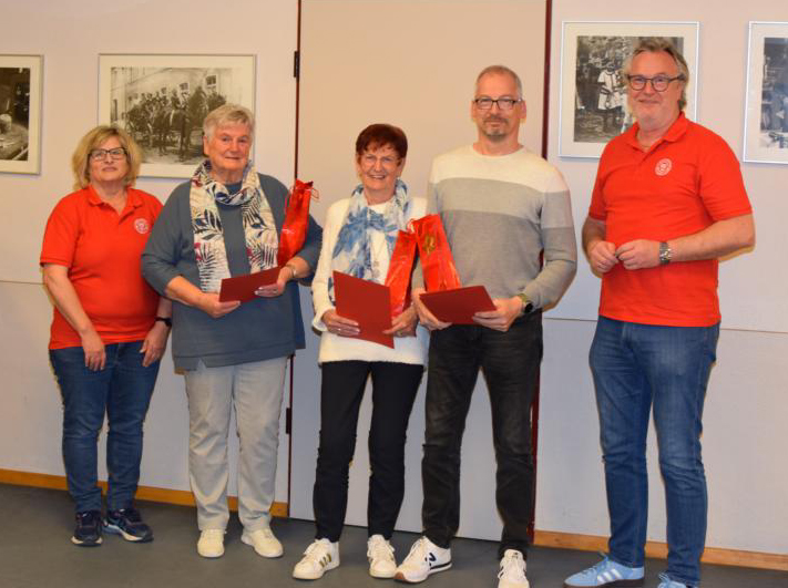 Für ihre langjährige Vereinstreue von 50 Jahren wurden mit goldener Ehrennadel und Urkunde die Mitglieder Marita Förger, Renate Kolbe und Marcus Förger geehrt. Ebenso auch Wolfgang Braun und Mariele Schwaderlapp in Abwesenheit. Eine besondere Ehrung erhielt Inge Schmidt für 70 Jahre TuS-Mitgliedschaft. In Abwesenheit wurde sie zum Ehrenmitglied ernannt. Herzliche Glückwünsche allen geehrten Mitgliedern!